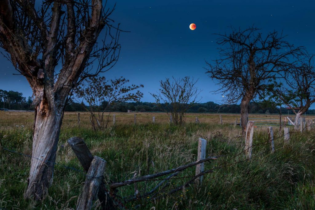 Blutmond in den Rieselfeldern | 6 Sek. bei f / 9,0 und ISO 3200